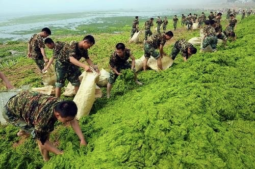 Ulva can be quite a nuisance in areas that are nutrient enriched from sewage outfalls, such as Ireland (Clonakilty Bay, Cork Harbour and Belfast Lough), the south coast of Enlgand (Langstone Harbour), and some estuaries in Brittany, where populations of Ulva may cover large areas of mudflats in the summer. Famously, a massive bloom of Ulva prolifera occurred in the Yellow Sea during the Olympics in June 2008 (below, Chinese troops clearing drift Ulva in Quingdao), which is said to have cost over $100 million to remediate. Minor blooms occur in the rocky intertidal of most populatied countries now.
